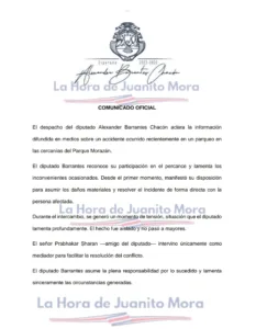 Comunicado oficial del diputado oficialista Alexander Barrantes respecto a la colisión en un parqueo público