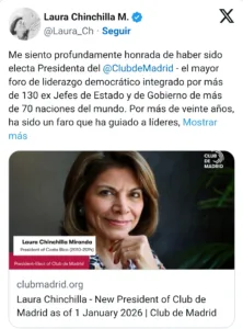 La expresidente de la República, Laura Chinchilla Miranda fue electa como presidente del Club de Madrid, el principal foro mundial de exmandatarios, a partir del próximo año.