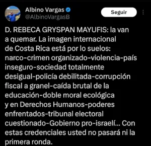 «La van a quemar» La imagen internacional de Costa Rica está por lo suelos: narco-crimen organizado-violencia-país inseguro-sociedad totalmente desigual-policía debilitada-corrupción fiscal a granel-caída brutal de la educación-doble moral ecológica y en Derechos Humanos-poderes enfrentados-tribunal electoral cuestionado-Gobierno pro-israelí… Con estas credenciales usted no pasará ni la primera ronda. Aseguró el sindicalista de la ANEP Albino Vargas.
