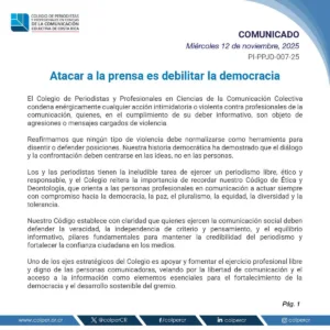 Comunicado del Colegio de Periodistas. «Atacar a la prensa es debilitar la democracia».