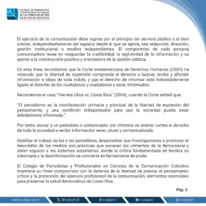 El Colegio de Periodistas y Profesionales en Ciencias de la Comunicación Colectiva de Costa Rica (Colper) emitió un comunicado en el que rechaza enérgicamente cualquier acción intimidatoria o violenta contra profesionales de la comunicación.