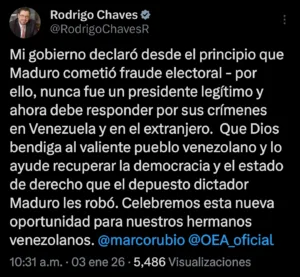 El mandatario Chaves manifestó «Mi gobierno declaró desde el principio que Maduro cometió fraude electoral – por ello, nunca fue un presidente legítimo y ahora debe responder por sus crímenes en Venezuela y en el extranjero. Que Dios bendiga al valiente pueblo venezolano y lo ayude recuperar la democracia y el estado de derecho que el depuesto dictador Maduro les robó. Celebremos esta nueva oportunidad para nuestros hermanos venezolanos,» afirmó.