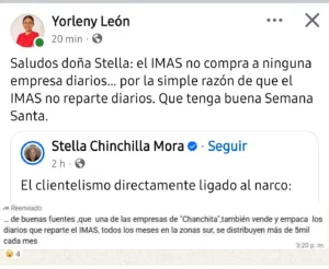 La Ministra de Desarrollo Humano e Inclusión Social, Yorleny León Marchena, desmintió públicamente a la «comunicadora» Stella Chinchilla Mora, la cual utilizó sus redes sociales para arremeter contra el Instituto Mixto de Ayuda Social (IMAS) señalando a la institución de «Clientelismo ligado al narco».
