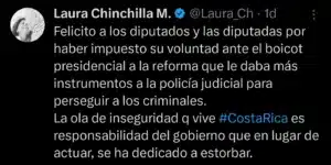 Felicito a los diputados y las diputadas por haber impuesto su voluntad ante el boicot presidencial a la reforma que le daba más instrumentos a la policía judicial para perseguir a los criminales. Agregó Chinchilla.