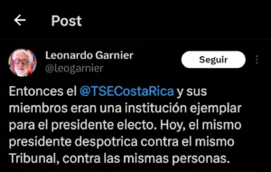 Garnier manifestó «Entonces el @TSECostaRica y sus miembros eran una institución ejemplar para el presidente electo. Hoy, el mismo presidente despotrica contra el mismo Tribunal, contra las mismas personas» indicó.