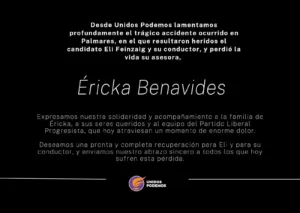 La candidata presidencial del partido Unidos Podemos, Natalia Díaz Quintana, envió su más sentido pésame a la familia de Ericka Benavides quién falleció en un accidente automovilístico la mañana de este viernes.
