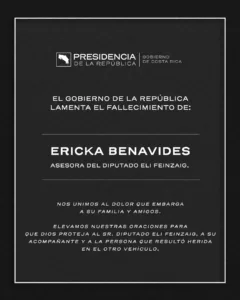 El presidente Rodrigo Chaves Robles y su equipo de trabajo lamentan profundamente el fallecimiento de la señora Ericka Benavides Garbanzo, a raíz del trágico accidente ocurrido en la carretera Bernardo Soto.