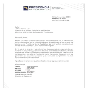 Reciba un atento y respetuoso saludo. De conformidad con la información oficial comunicada por el Tribunal Supremo de Elecciones, el día de ayer fue electa como Presidente de la República, para el período constitucional 2026-2030, la señora Laura Fernández Delgado.